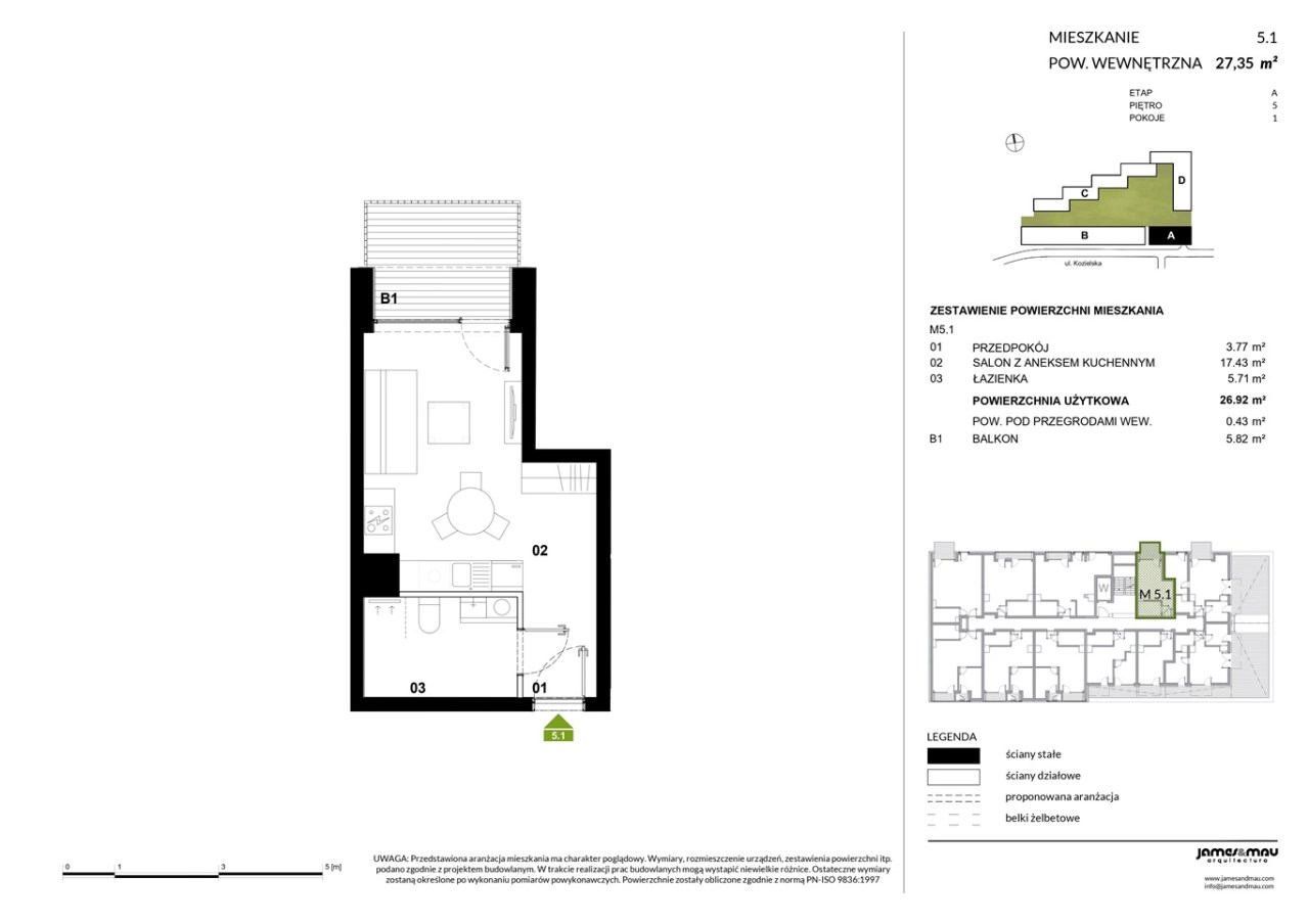 Oferowany apartament znajduje się na piątym piętrze i ma powierzchnie ponad 27 mkw, na którą składają się: salon z aneksem kuchennym, łazienka z ubikacją i przedpokój. Z pokoju dziennego jest wyjście na balkon.