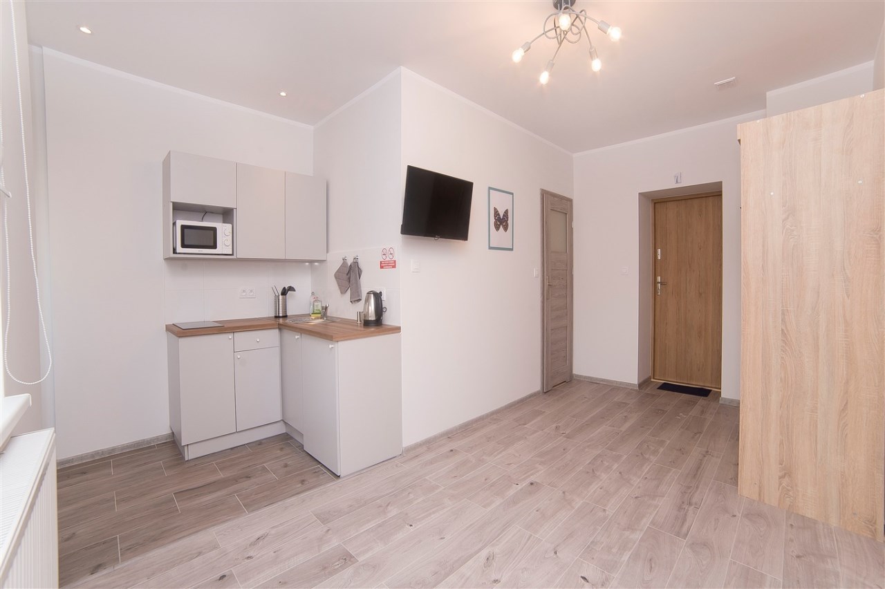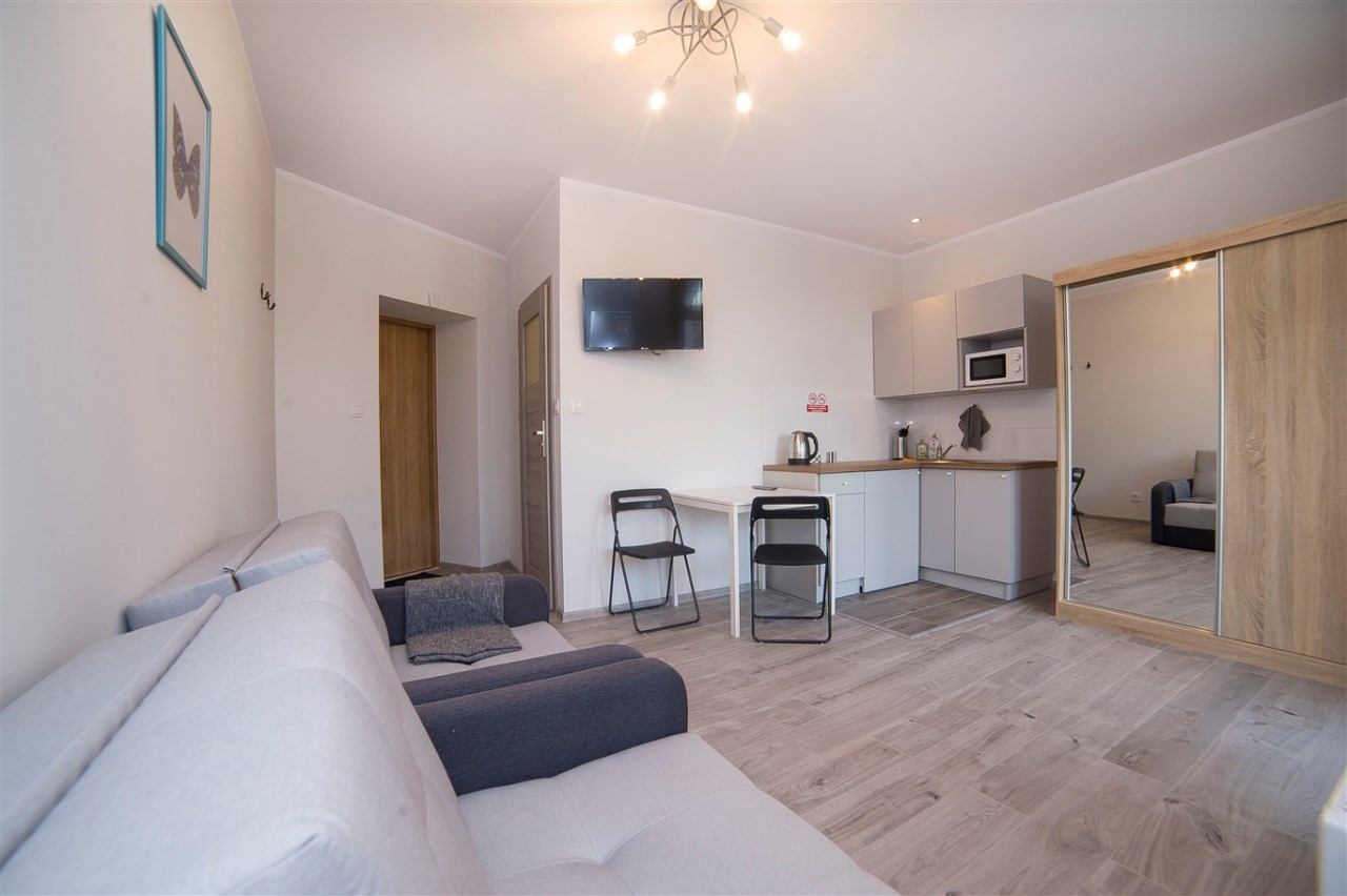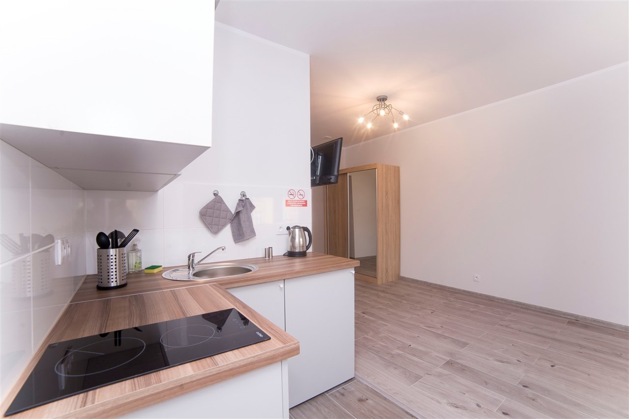 Część kawalerek posiada również balkon. Lokale są w pełni umeblowane i wyposażone, dzięki czemu najemcy mogą wprowadzić się od razu.