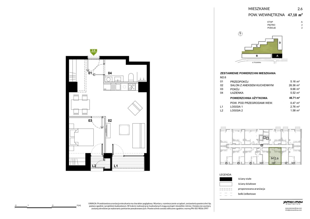 Oferowany apartament znajduje się na drugim piętrze i ma powierzchnie ponad 47 mkw, na którą składają się: salon z aneksem kuchennym, sypialnia, łazienka z ubikacją i przedpokój. Z pokoju dziennego oraz sypialni jest wyjście na loggie.