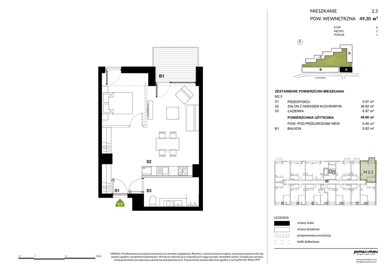 Oferowany apartament znajduje się na drugim piętrze i ma powierzchnie ponad 49 mkw, na którą składają się: salon z aneksem kuchennym, łazienka z ubikacją i przedpokój. Z pokoju dziennego jest wyjście na balkon.