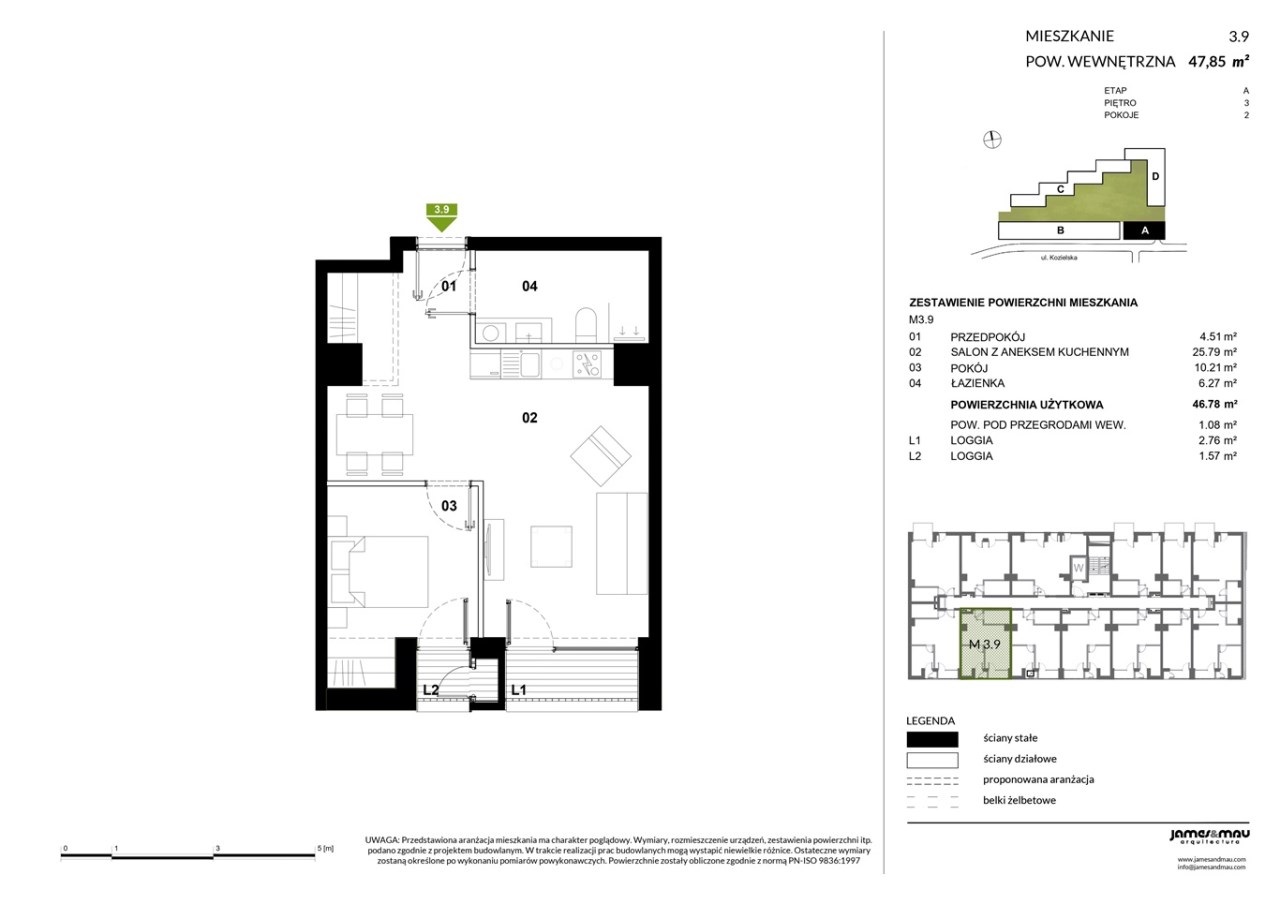 Oferowany apartament znajduje się na trzecim piętrze i ma powierzchnie ponad 47 mkw, na którą składają się: salon z aneksem kuchennym, sypialnia, łazienka z ubikacją i przedpokój. Z pokoju dziennego oraz sypialni są wyjścia na loggie.