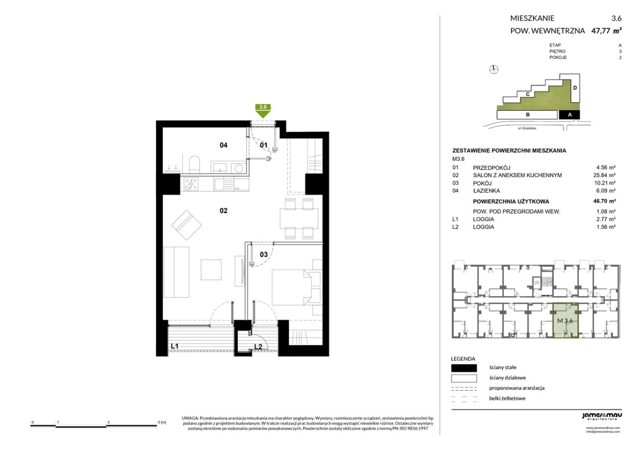 Oferowany apartament znajduje się na trzecim piętrze i ma powierzchnie ponad 47 mkw, na którą składają się: salon z aneksem kuchennym, sypialnia, łazienka z ubikacją i przedpokój. Z pokoju dziennego oraz sypialni jest wyjście na loggie.