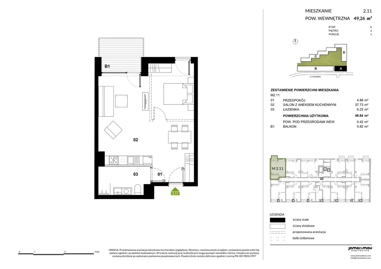 Oferowany apartament znajduje się na drugim piętrze i ma powierzchnie ponad 49 mkw, na którą składają się: salon z aneksem kuchennym, łazienka z ubikacją i przedpokój. Z pokoju dziennego jest wyjście na balkon.