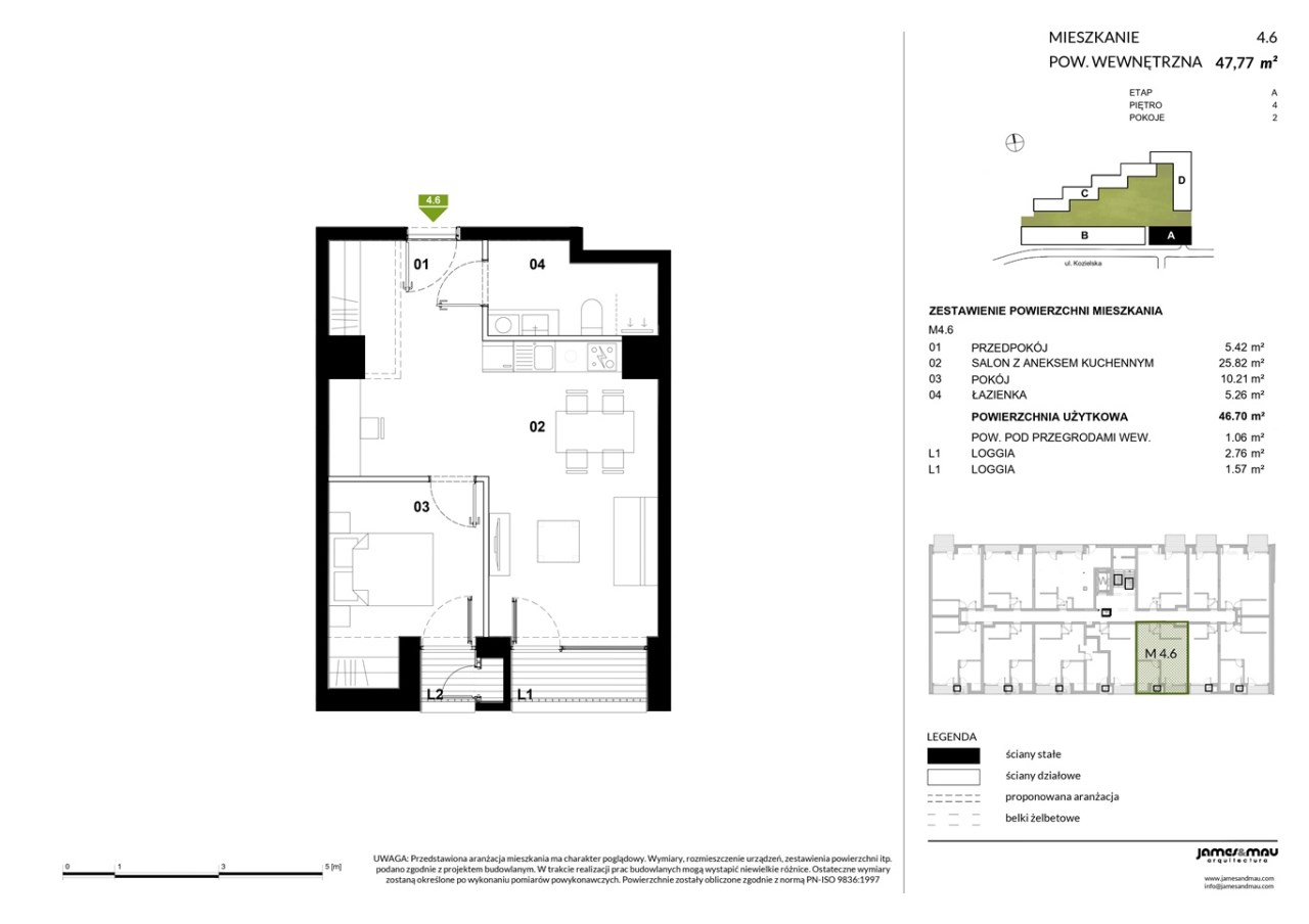 Oferowany apartament znajduje się na czwartym piętrze i ma powierzchnie ponad 47 mkw, na którą składają się: salon z aneksem kuchennym, sypialnia, łazienka z ubikacją i przedpokój. Z pokoju dziennego i sypialni jest wyjście na loggie.