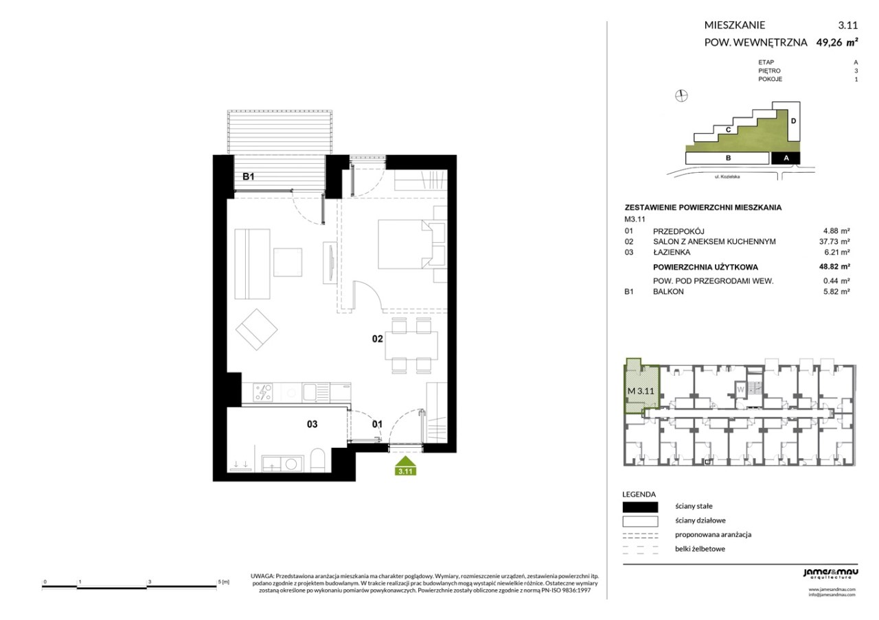 Oferowany apartament znajduje się na trzecim piętrze i ma powierzchnie ponad 49 mkw, na którą składają się: salon z aneksem kuchennym, sypialnia, łazienka z ubikacją i przedpokój. Z pokoju dziennego jest wyjście na balkon.