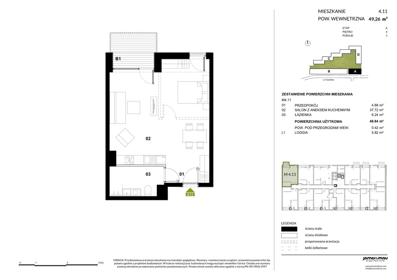 Oferowany apartament znajduje się na czwartym piętrze i ma powierzchnie ponad 49 mkw, na którą składają się: salon z aneksem kuchennym, łazienka z ubikacją i przedpokój. Z pokoju dziennego jest wyjście na loggie.