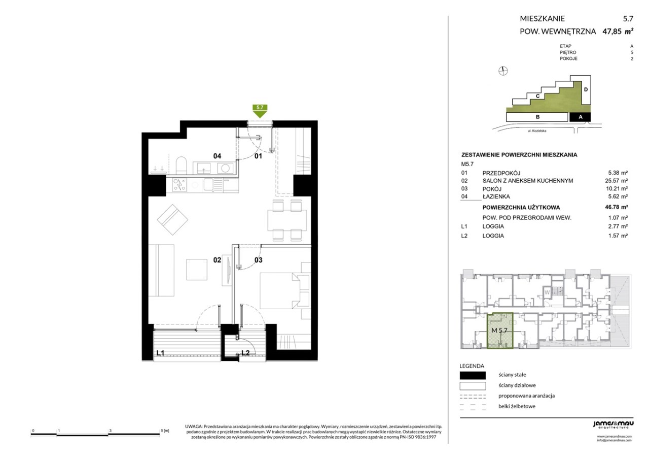 Oferowany apartament znajduje się na piątym piętrze i ma powierzchnie ponad 47 mkw, na którą składają się: salon z aneksem kuchennym, sypialnia, łazienka z ubikacją i przedpokój. Z pokoju dziennego i sypialni jest wyjście na loggie.