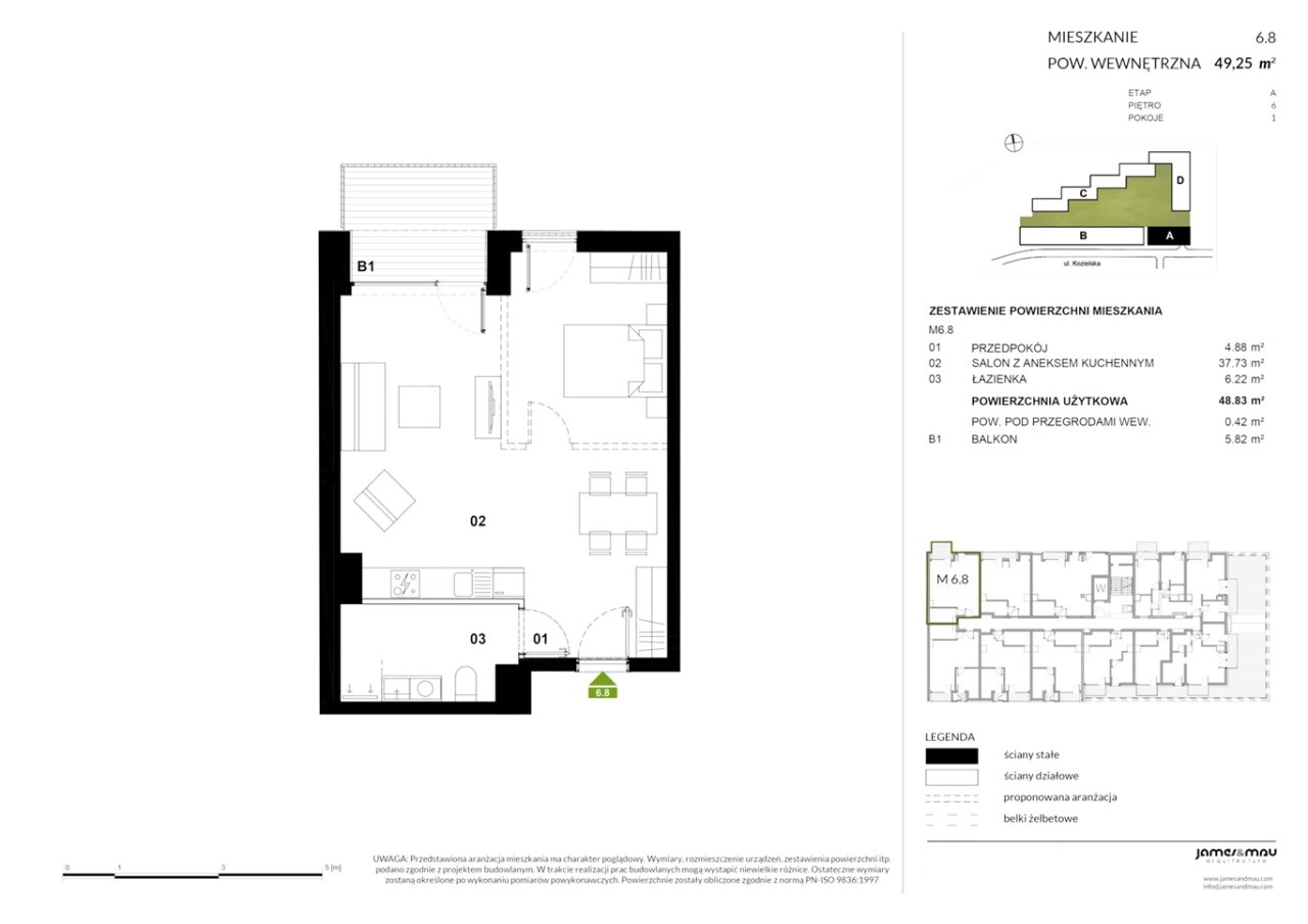 Oferowany apartament znajduje się na szóstym piętrze i ma powierzchnie ponad 49 mkw, na którą składają się: salon z aneksem kuchennym, sypialnia, łazienka z ubikacją i przedpokój. Z pokoju dziennego jest wyjście na balkon.