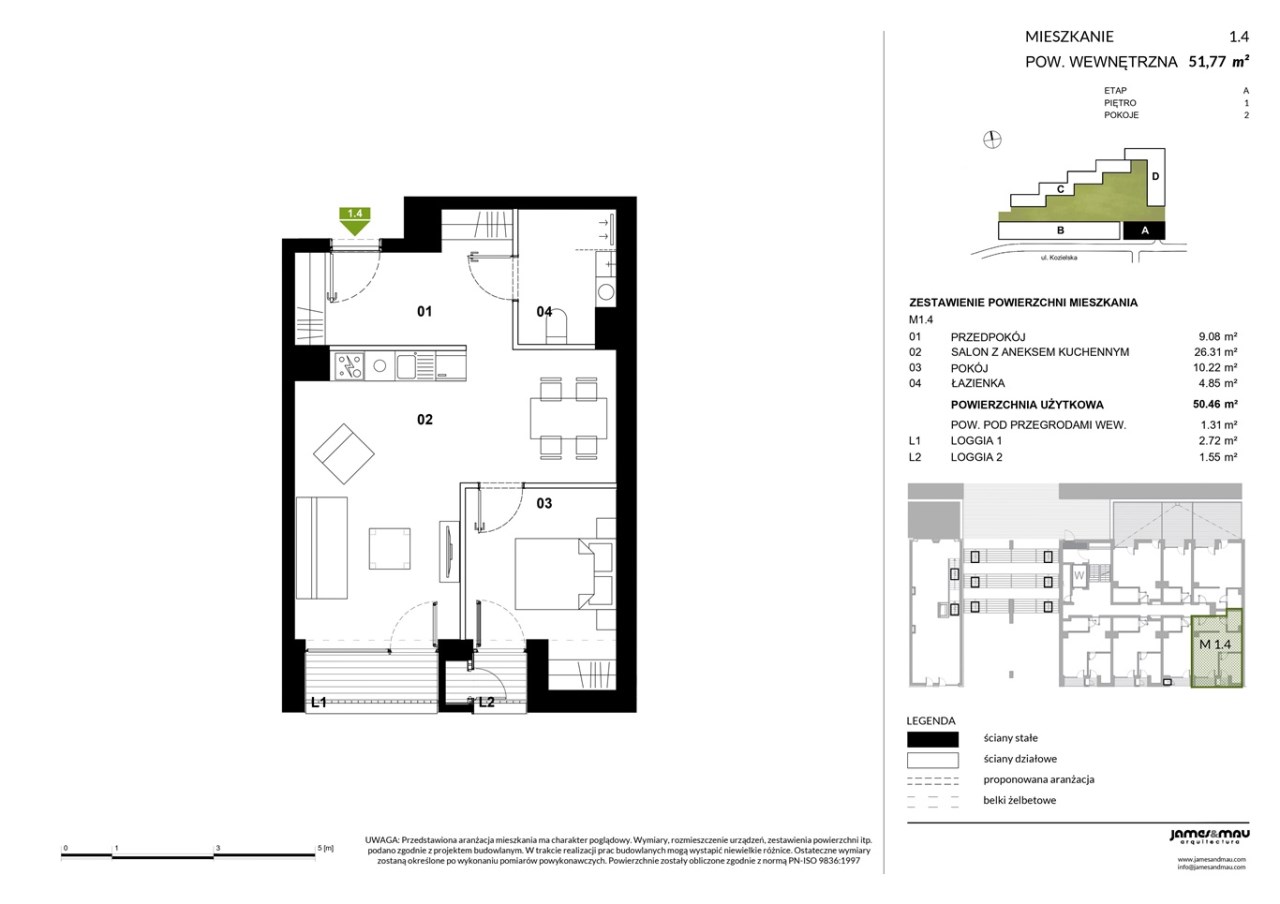 Oferowany apartament znajduje się na pierwszym piętrze i ma powierzchnie ponad 52 mkw, na którą składają się: salon z aneksem kuchennym, sypialnia, łazienka z ubikacją i przedpokój. Z pokoju dziennego oraz z sypialni jest wyjście na loggie.