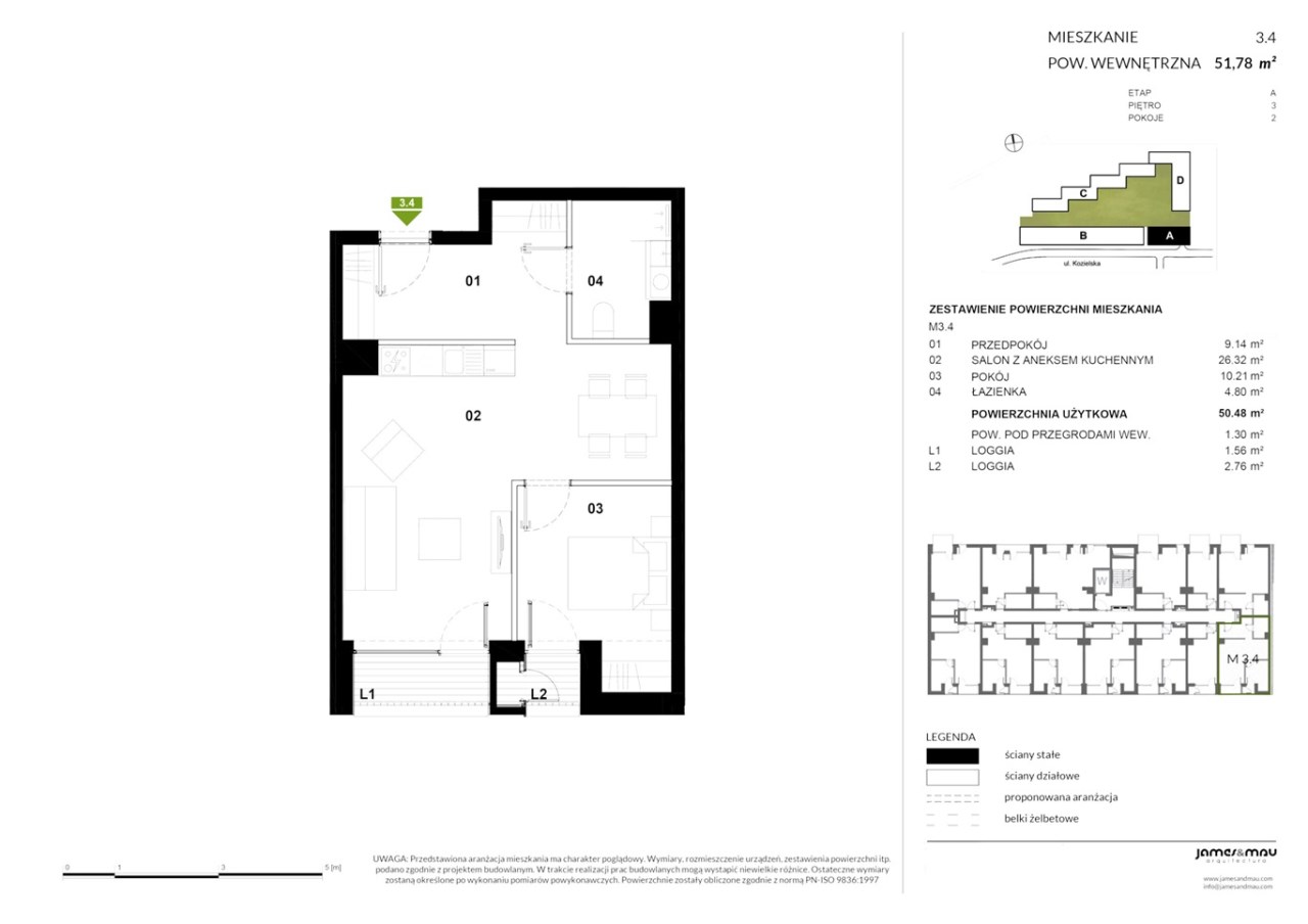 Oferowany apartament znajduje się na trzecim piętrze i ma powierzchnie ponad 51 mkw, na którą składają się: salon z aneksem kuchennym, sypialnia, łazienka z ubikacją i przedpokój. Z pokoju dziennego oraz sypialni są wyjścia na loggie.