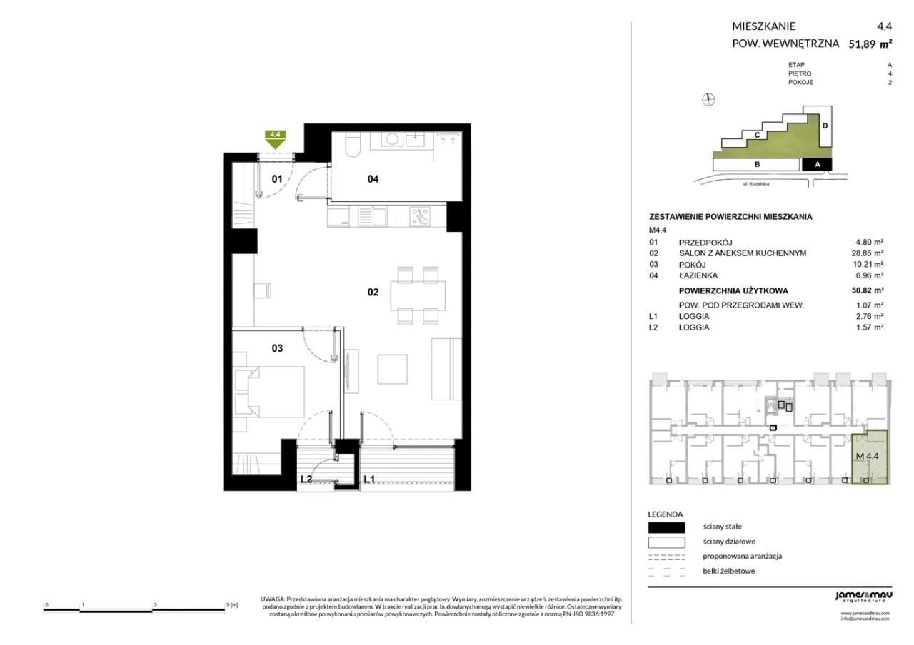 Oferowany apartament znajduje się na czwartym piętrze i ma powierzchnie ponad 51 mkw, na którą składają się: salon z aneksem kuchennym, sypialnia, łazienka z ubikacją i przedpokój. Z pokoju dziennego i sypialni jest wyjście na loggie.
