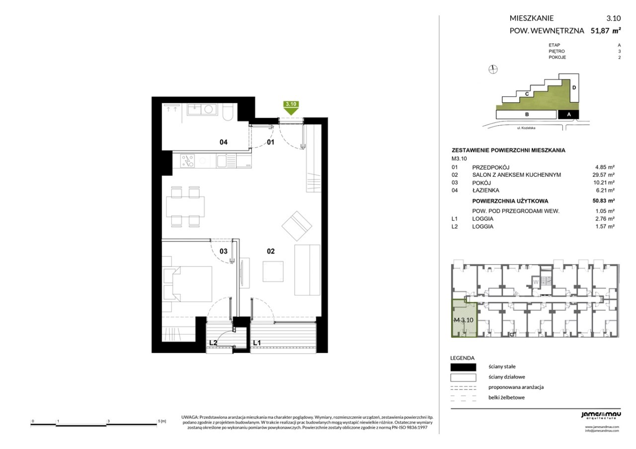 Oferowany apartament znajduje się na trzecim piętrze i ma powierzchnie ponad 51 mkw, na którą składają się: salon z aneksem kuchennym, sypialnia, łazienka z ubikacją i przedpokój. Z pokoju dziennego oraz sypialni są wyjścia na loggie.