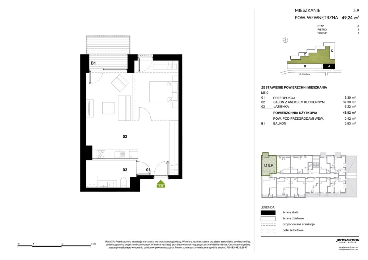 Oferowany apartament znajduje się na piątym piętrze i ma powierzchnie ponad 51 mkw, na którą składają się: salon z aneksem kuchennym, sypialnia, łazienka z ubikacją i przedpokój. Z pokoju dziennego i sypialni jest wyjście na loggie.