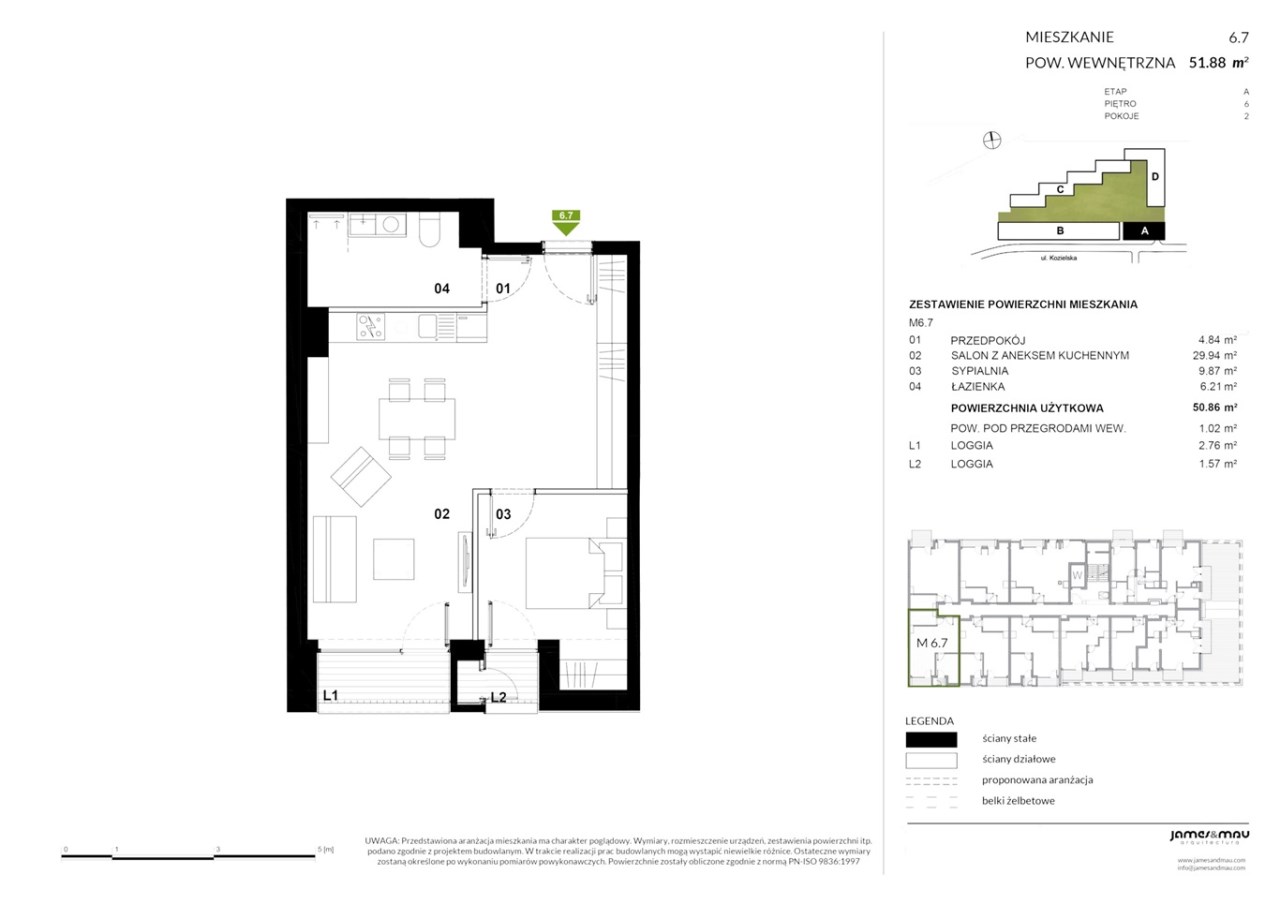 Oferowany apartament znajduje się na szóstym piętrze i ma powierzchnie ponad 51 mkw, na którą składają się: salon z aneksem kuchennym, sypialnia, łazienka z ubikacją i przedpokój. Z pokoju dziennego jest wyjście na loggie.