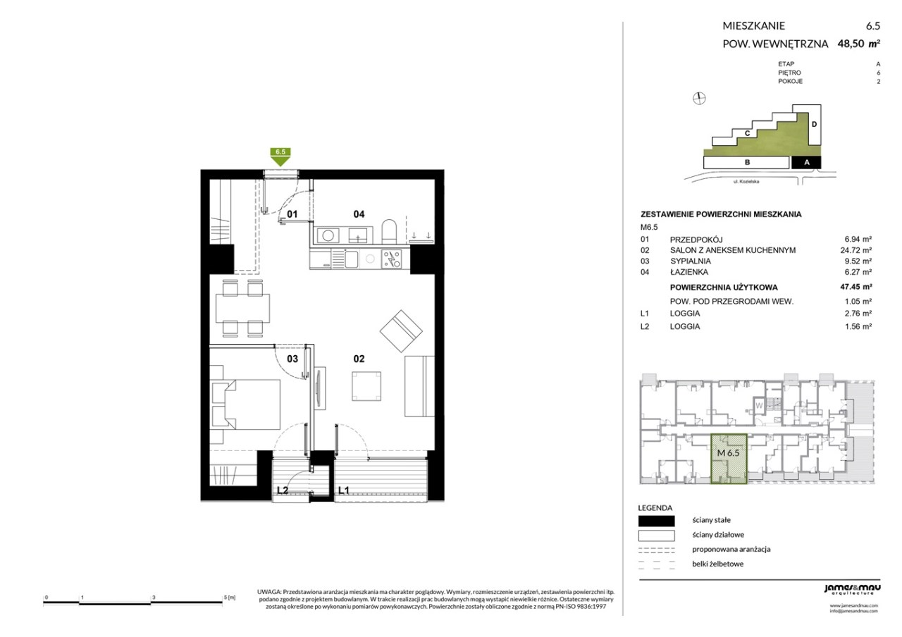 Oferowany apartament znajduje się na szóstym piętrze i ma powierzchnie ponad 48 mkw, na którą składają się: salon z aneksem kuchennym, sypialnia, łazienka z ubikacją i przedpokój. Z pokoju dziennego jest wyjście na loggie.