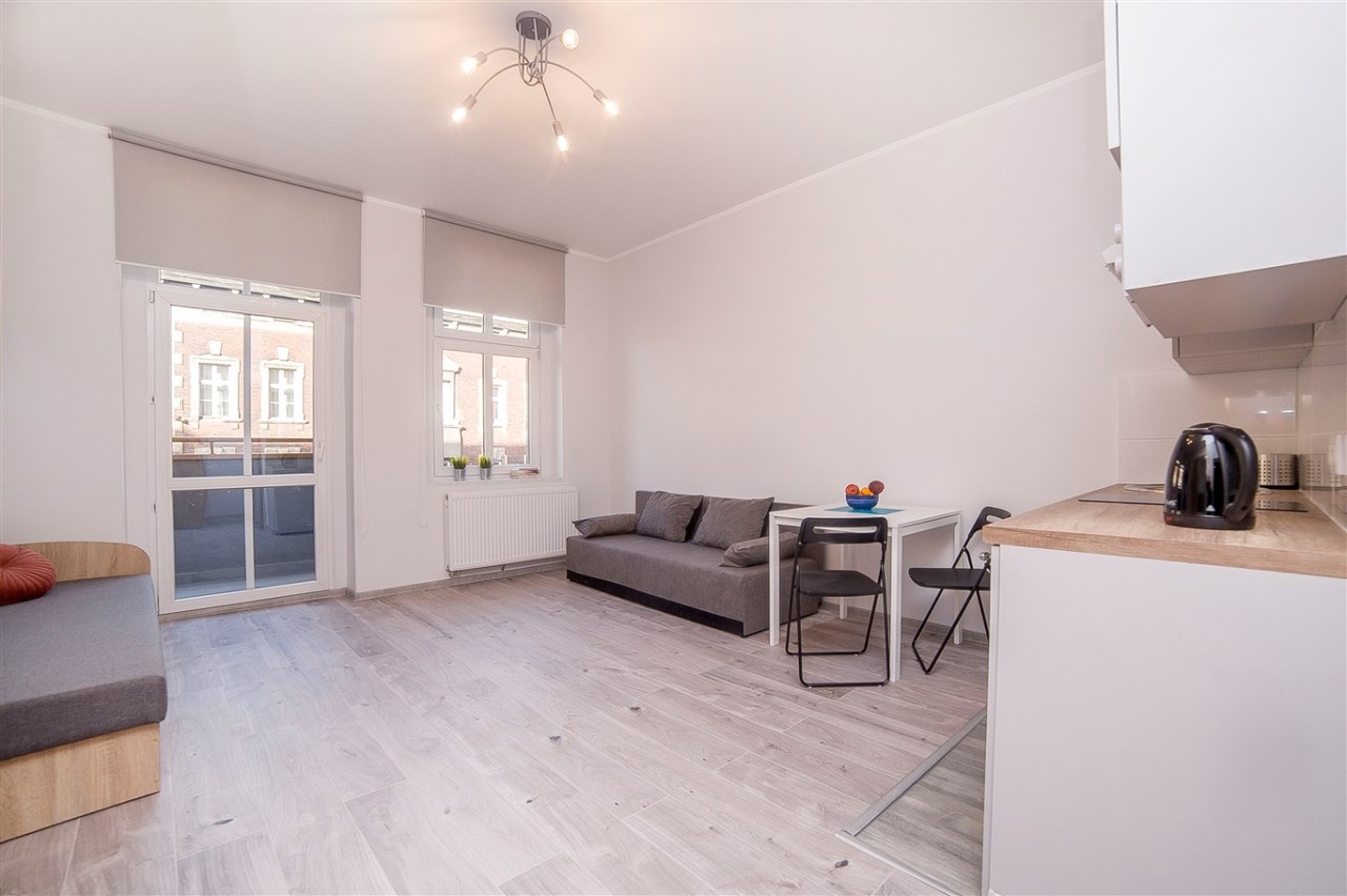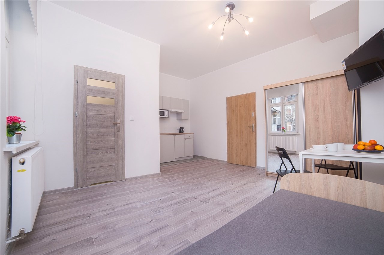 Część kawalerek posiada również balkon. Lokale są w pełni umeblowane i wyposażone, dzięki czemu najemcy mogą wprowadzić się od razu.