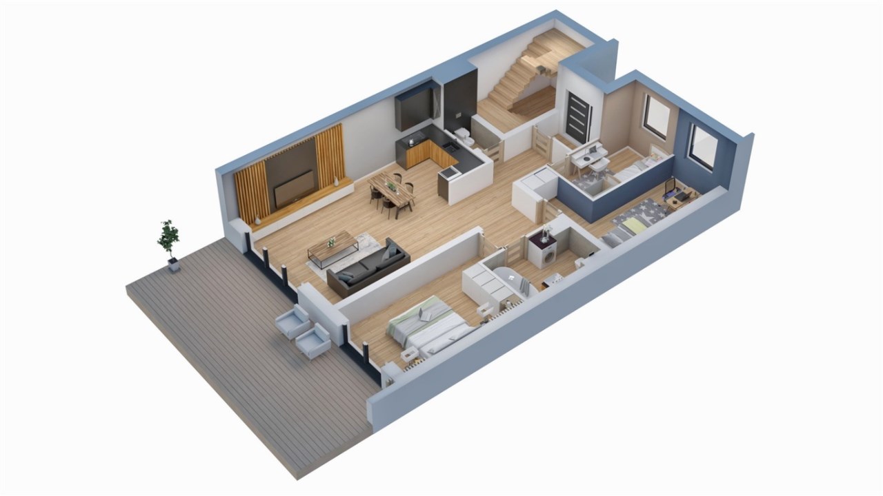 Z salonu prowadzi bezpośrednie wyjście na taras o powierzchni aż 32 mkw, który stanowi idealną przestrzeń do wypoczynku, spotkań rodzinnych i aranżacji zielonej strefy relaksu.