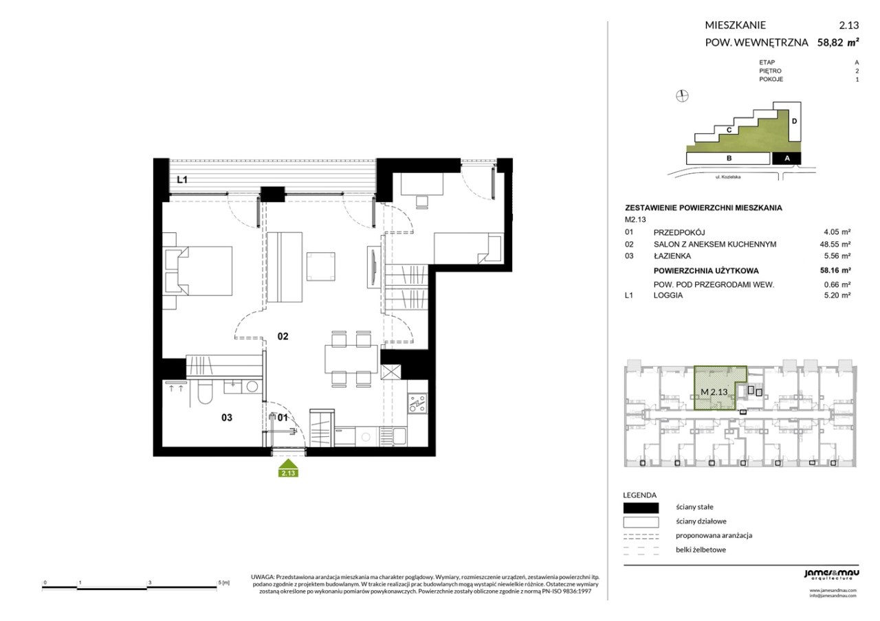 Oferowany apartament znajduje się na drugim piętrze i ma powierzchnie ponad 58 mkw, na którą składają się: salon z aneksem kuchennym, łazienka z ubikacją i przedpokój. Z pokoju dziennego jest wyjście na loggie.
