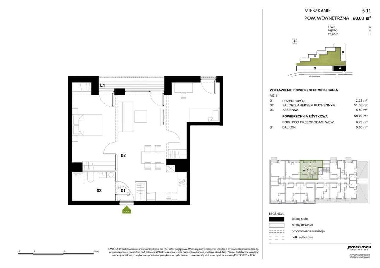 Oferowany apartament znajduje się na piątym piętrze i ma powierzchnie ponad 58 mkw, na którą składają się: salon z aneksem kuchennym, dwie sypialnie, łazienka z ubikacją i przedpokój. Z pokoju dziennego i sypialni jest wyjście na loggie.