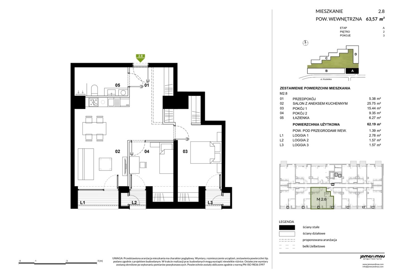 Oferowany apartament znajduje się na drugim piętrze i ma powierzchnie ponad 63 mkw, na którą składają się: salon z aneksem kuchennym, dwie sypialnie, łazienka z ubikacją i przedpokój. Z pokoju dziennego oraz sypialni są wyjście na loggie.